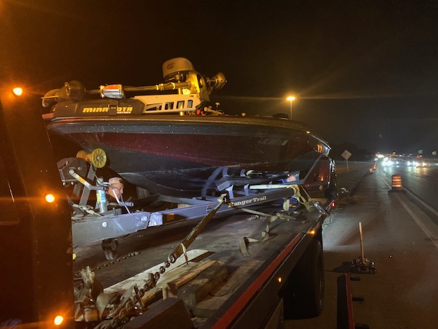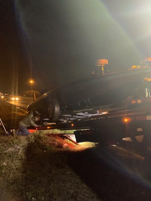 And on top of all the fun we had I forgot ( will never forget ) about Steve and I having a trailer tire blow on the Skyway heading to Clewiston. Then heading back just out of Clewiston we had a hub go out. Guess that is a good thing about tandem trailer. Chuck and Justin were behind us and followed us as we drove slow and steady back home at 55 MPH. Then in Sarasota Justin called and said smoke was coming out of the wheel on the same side as the other hub went. WTF !!! We were officially stranded on I-75. This was around 4:00PM. Chuck was gracious to take Jason and Justin home. Thank You Chuck! Now thinking I have AAA with Plus RV we would call and arrange flatbed towing. After numerous calls to AAA and them submitting service request after an hour I called back and was informed they could not find anyone in there network to help us. Now it is dark and we are out of beer….lol. We must have called 15 different towing companies with no luck. Jason found Lucas Towing so we called and they agreed to help but would be an hour and a half before they could get to us. We finally made it home around 2:00am. And Darrell’s phone crapped out and after Chuck got home he noticed a nice scratch and chunk missing out of his gelcoat. Again Fun Times!!!